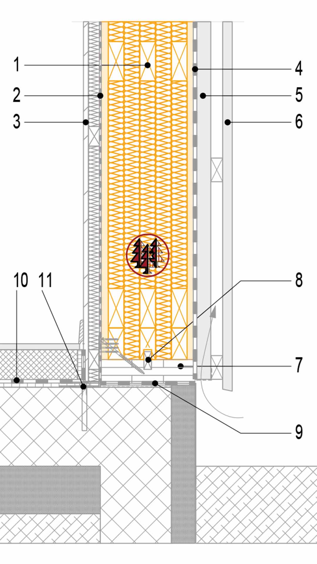 Ce détail montre l’ancrage d’un mur CL-Therm (1) sur une dalle en béton à l’aide d’une lisse d’implantation (7) munie d’une fausse languette (8), assurant la continuité structurelle et l’étanchéité à l’air. Le panneau comprend un pare-vapeur (2), selon la physique du bâtiment, et côté intérieur une plaque de plâtre avec vide technique (3). À l’extérieur, on trouve un pare-pluie (4), une lame d’air et un lattage (5), puis le bardage extérieur (6). L’assise du mur est protégée par une étanchéité et un lit de mortier (9). Le plancher (10) repose sur une équerre et un ancrage béton (11) dimensionnés selon les exigences statiques.