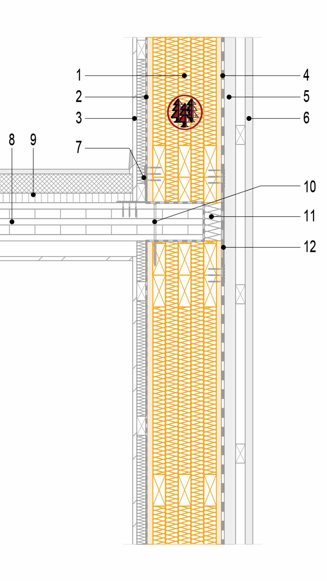 Ce détail présente la jonction entre un mur CL-Therm (1) et un plancher CLT (8), assurant la continuité structurelle et thermique de l’enveloppe. Le mur comprend un pare-vapeur (2) selon la physique du bâtiment, une plaque de plâtre avec vide technique (3) côté intérieur, et à l’extérieur un pare-pluie (4), une lame d’air et un lattage (5), puis le bardage extérieur (6). L’assemblage est renforcé par une équerre (7) et une plaque de traction (12) dimensionnées selon la statique, complétées par des vis d’assemblage (10). Un complément d’isolant (11) assure la continuité thermique entre le mur et le complexe plancher (9), garantissant performance et durabilité.
