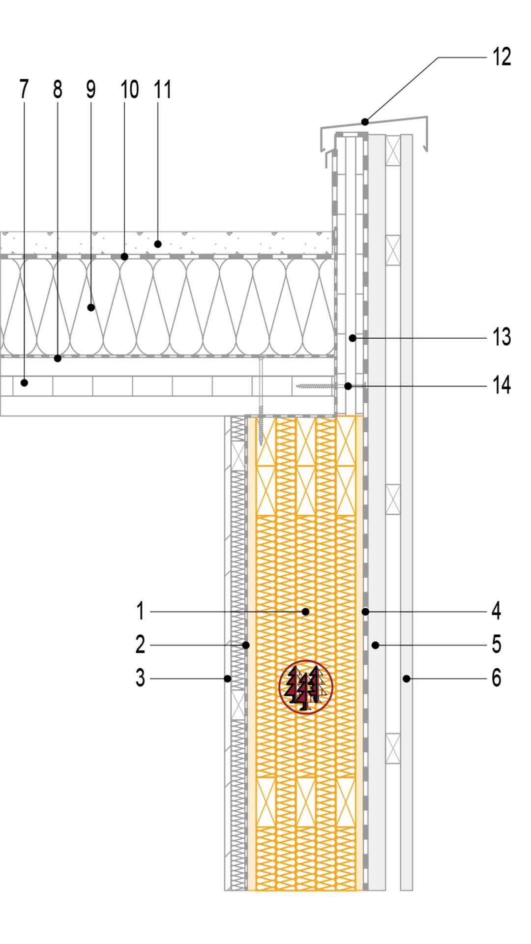 Ce détail illustre la jonction entre un mur CL-Therm (1) et une toiture CLT (7) dans une configuration de toiture-terrasse. Le complexe mural comprend un pare-vapeur (2) selon la physique du bâtiment, une plaque de plâtre avec vide technique (3), un pare-pluie (4), une lame d’air et un lattage (5), puis le bardage extérieur (6). La toiture est équipée d’un pare-vapeur (8), d’un isolant formant la pente (9), d’une étanchéité (10) et d’une couche protectrice (11). L’ensemble est couronné par une couvertine métallique (12) sur un acrotère CLT (13). Des vis d’assemblage (14) assurent la liaison mécanique entre les éléments pour une construction durable et parfaitement étanche.